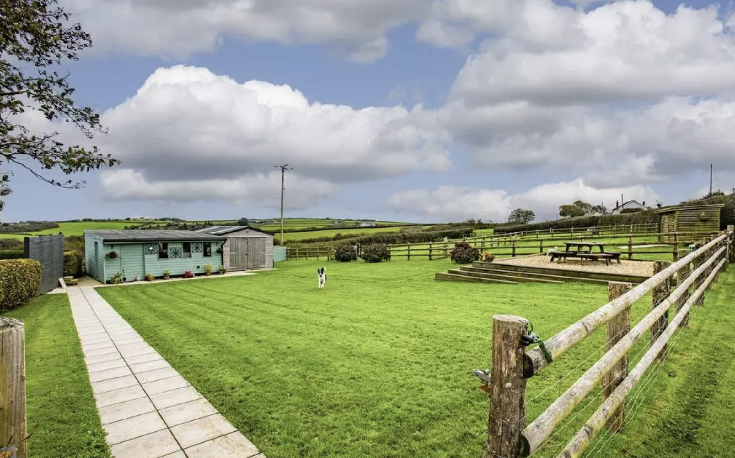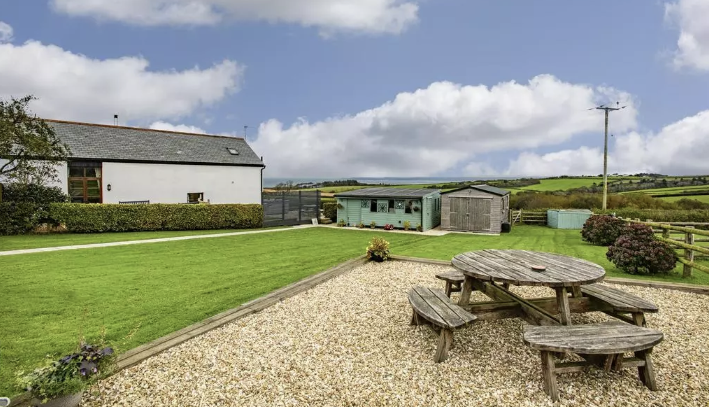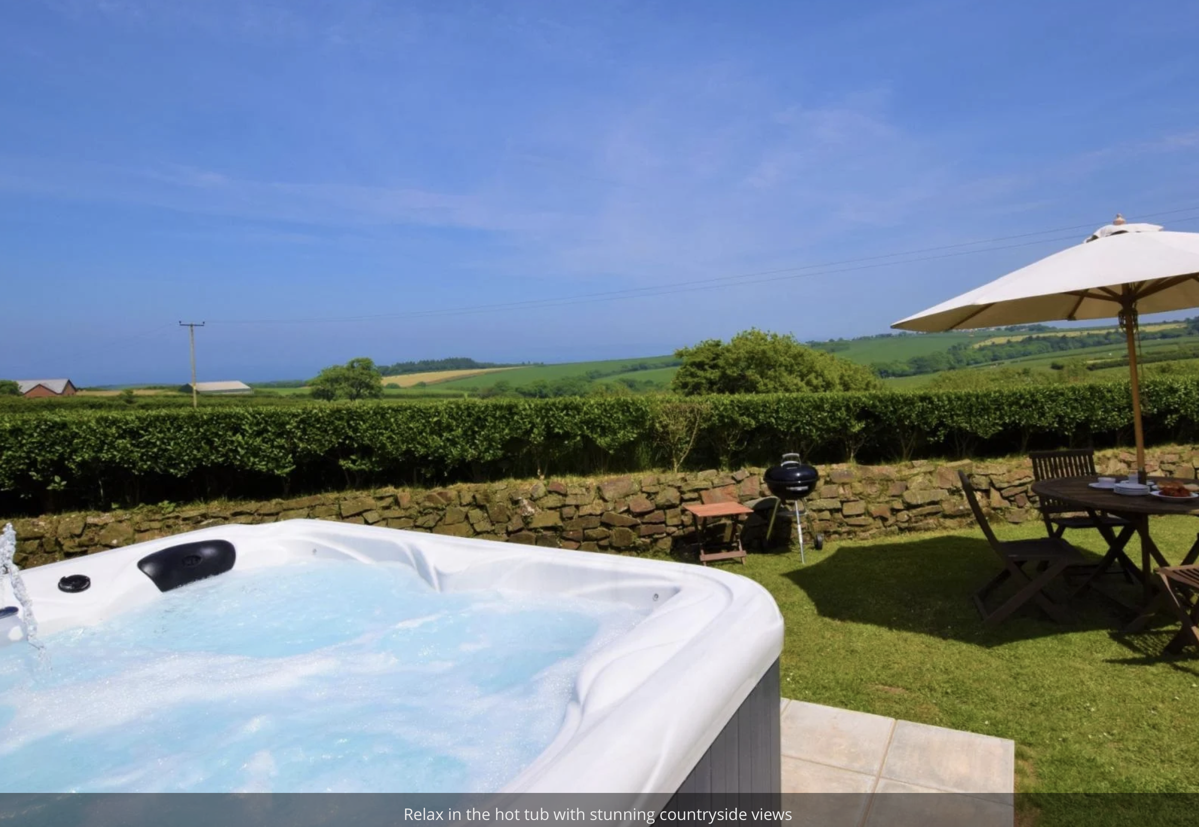 Outside is a private patio area with seating, charcoal BBQ and hot tub. This area is ideal to relax after a long day and unwind in the hot tub enjoying the views of the countryside and coastline.